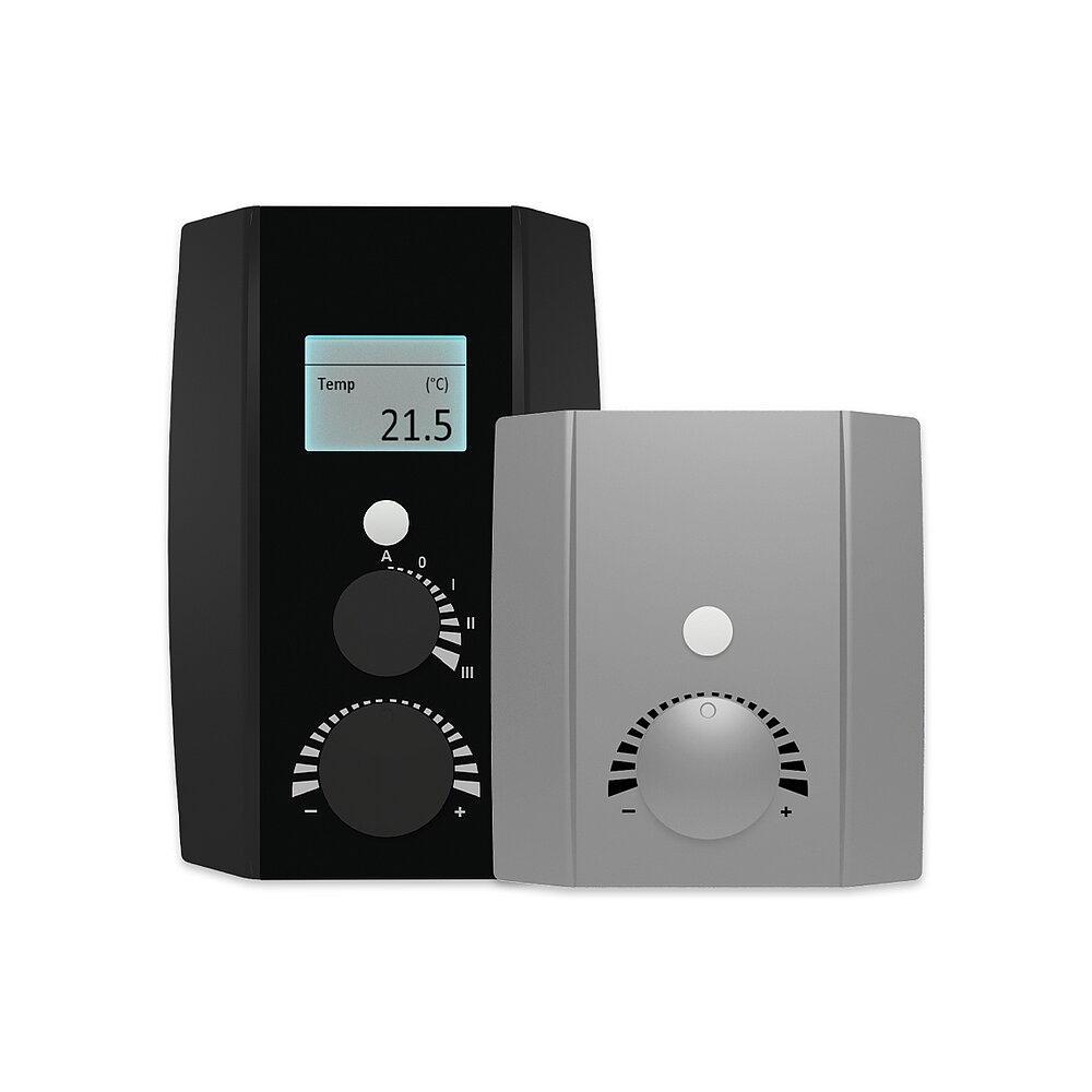 Die Raumbediengeräte NOVOS 5 und NOVOS 3 runden die neue Produktfamilie ab. NOVOS 5 kann mit einem Taster mit integrierter RGB-LED für die Visualisierung von Statusrückmeldungen sowie einem Temperatur-Sollwertversteller und einem Drehschalter zur Auswahl der Lüfterstufe geliefert werden. Das kompaktere Gehäuse von NOVOS 3 ist ebenfalls mit einem Sollwertversteller und Taster mit RGB-LED ausgestattet.