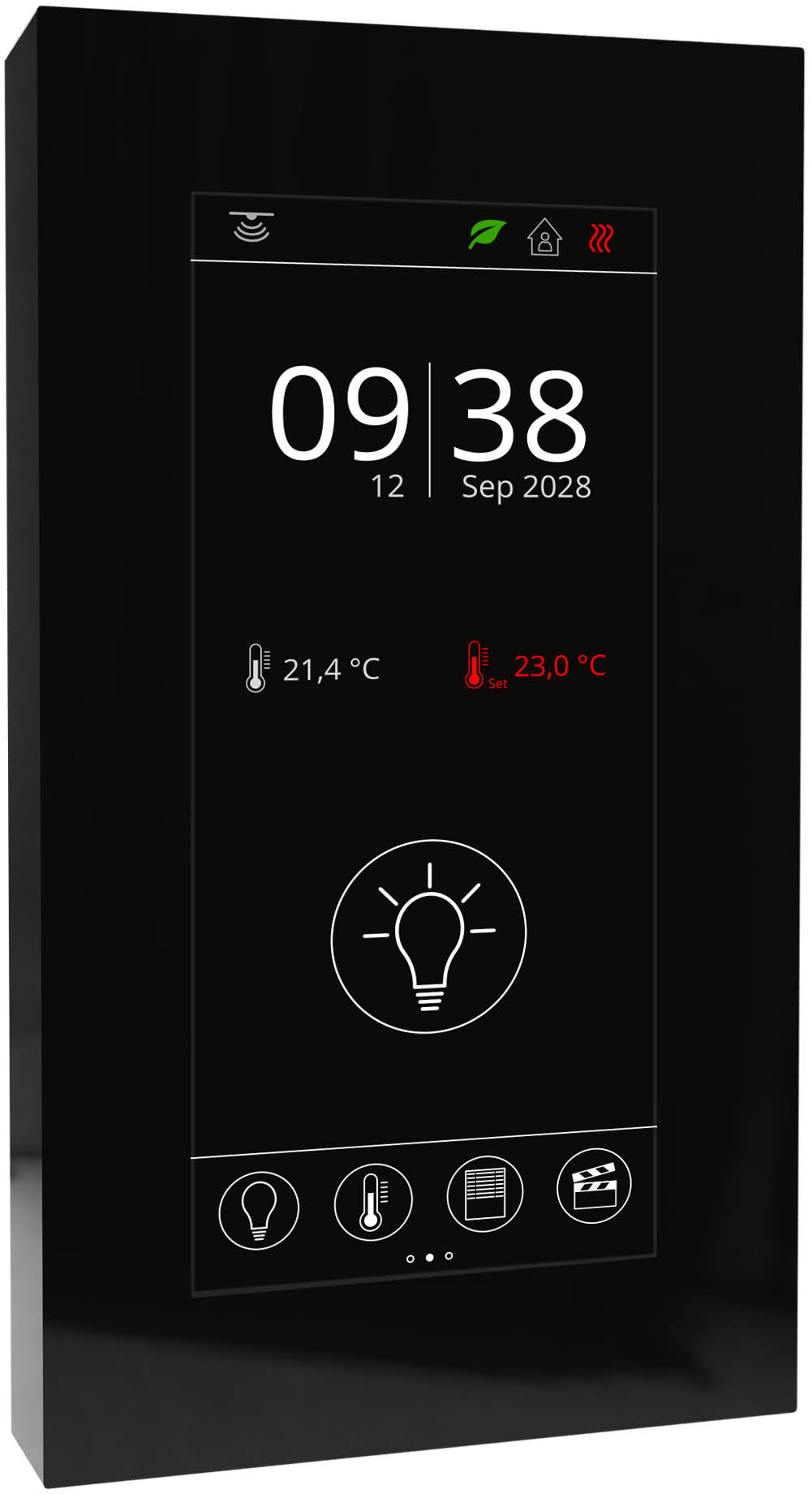 Sollwertverstellung Temperatur, Lüfterstufenverstellung, Präsenzmeldung, Licht ein/aus/dimmen, Jalousie auf/ab/verstellen, Szenen aufrufen, ECO-Funktion, Messwertanzeige und -historie, Farbtemperatur, Farbsteuerung RGBW |