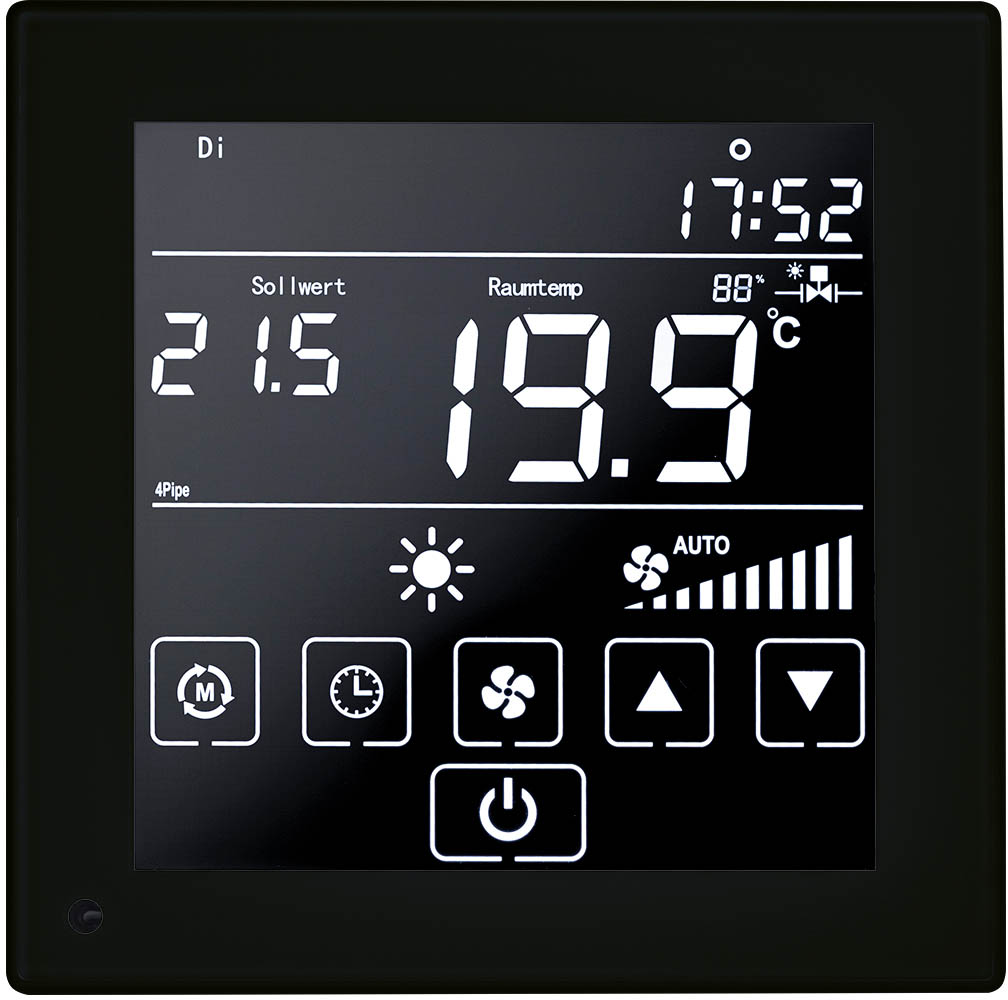 | Funktionen | Lüftersteuerung Relais, Heizen + Kühlen Relais, Change-Over, integrierter PI- und Zweipunkt-/Dreipunktregler, Frostschutz, Fenster-/Türüberwachung, Anwesenheit |