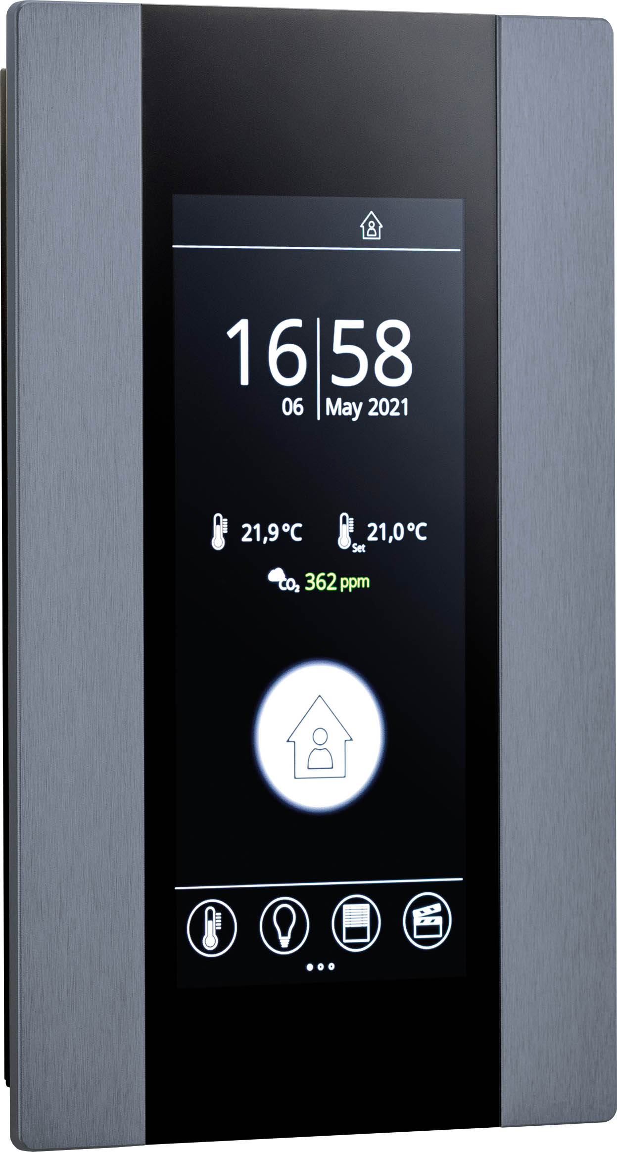 The high-grade materials and sophisticated design of the thanos EVO make it an outstanding room unit for high-end residential or commercial buildings. With its 4.8" touchscreen and up to 4 integrated sensors (temperature, relative humidity, CO2 and VOC), users can individually adjust multiple HVAC and lighting/blinds features. 2D room graphics make operations even more intuitive. External sensors and inputs enhance the multi-functionality of the thanos EVO.