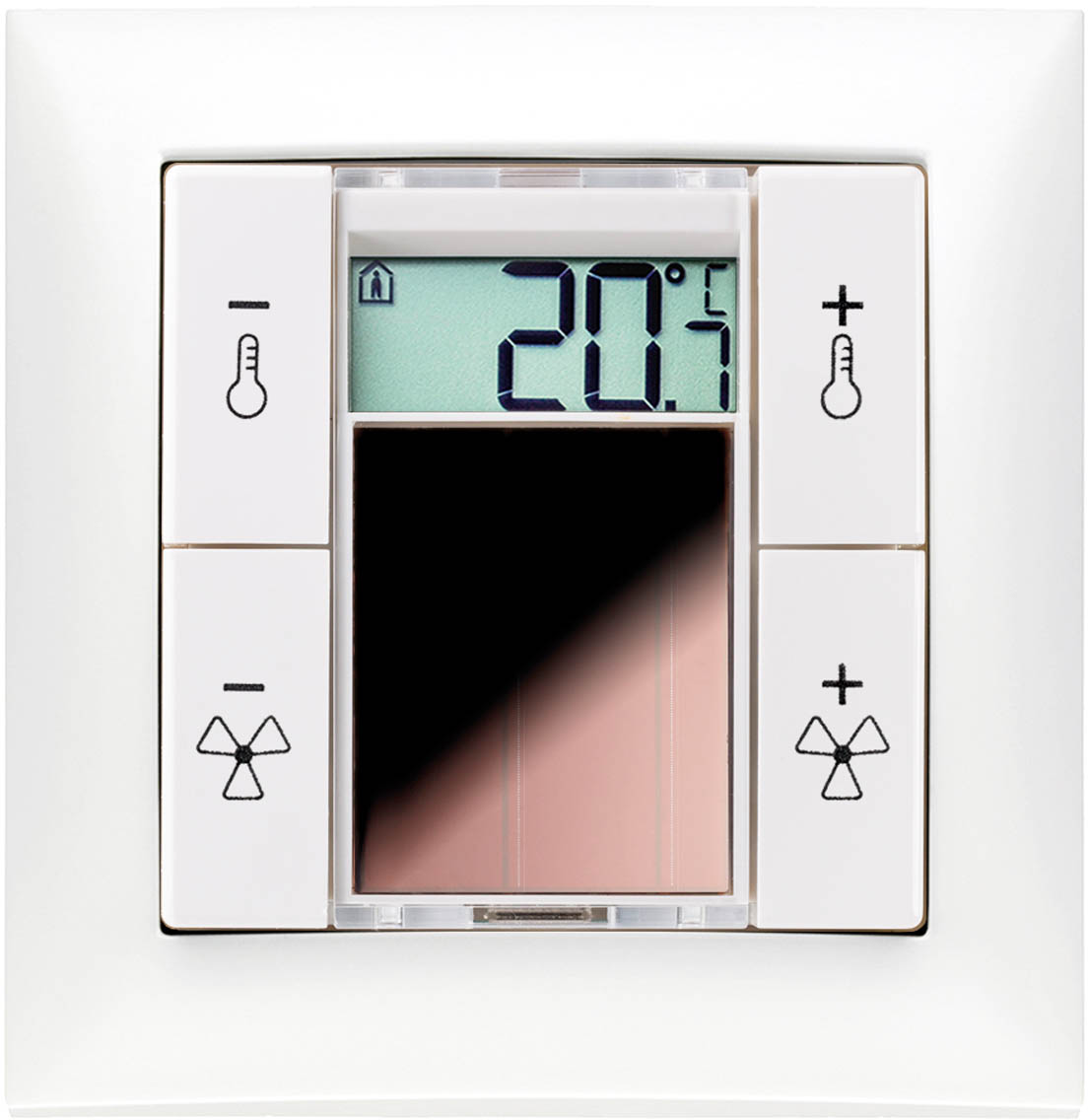 4 touches, étiquetage {[thermomètre] - [thermomètre] + [pale de ventilateur] - [pale de ventilateur] +} | réglage de consigne, par pas de ±1 à ±10 °C, configurable en option, réglage de l'étapes de ventilateur