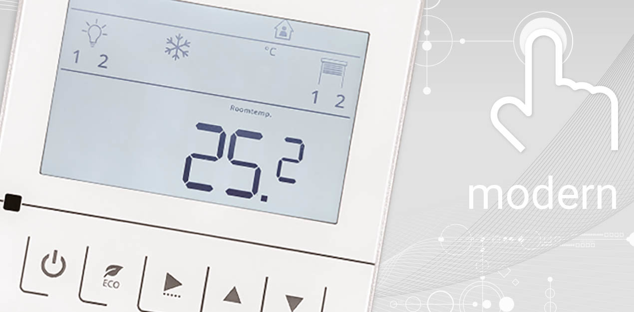 réglage de consigne 0..+50 °C, +16..+30 °C (paramètres par défaut), configurable en option, réglage de l'étapes de ventilateur, lumière ON/OFF/DIM, store UP/DOWN, fonction ECO, plusieurs affichages de statut |