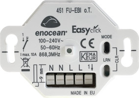 Bidirectionele inbouwradio-ontvanger voor EnOcean-schakeltelegrammen voor het schakelen van verlichtingsbronnen (bijv. licht aan/uit, trappenhuisfunctie, schemerschakelaar, etc.). De functies kunnen worden geparametreerd via een programmeertoets.