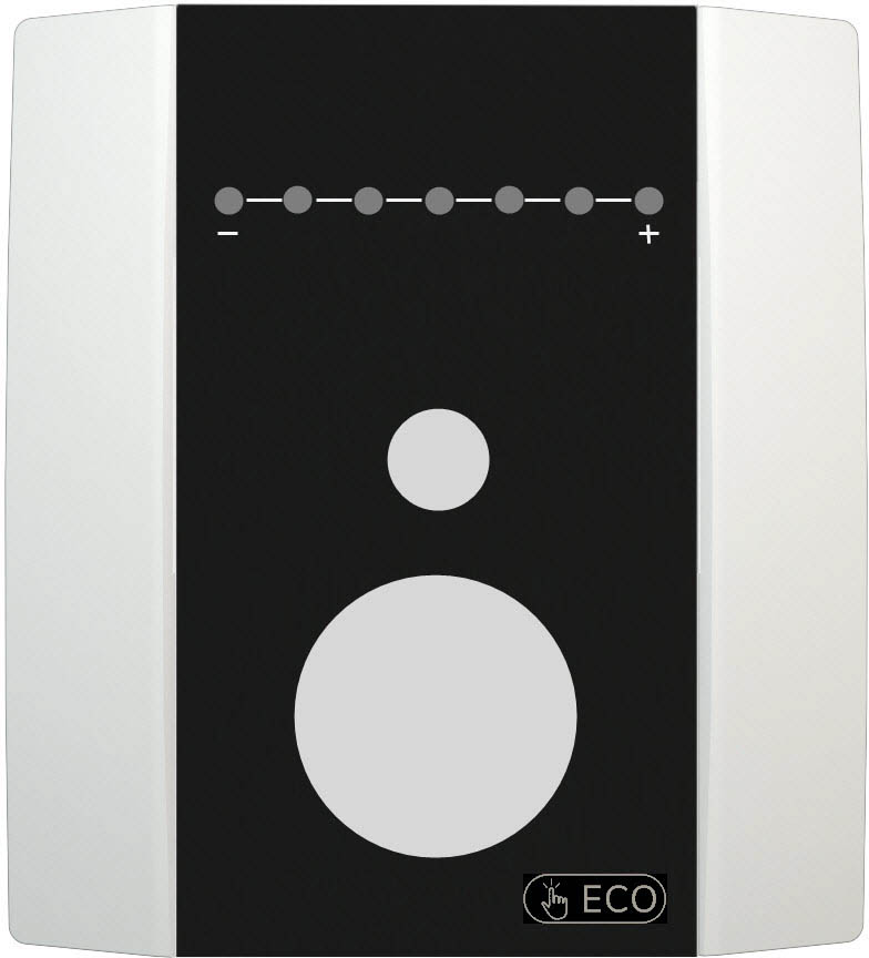 pokrętło enkoder/przycisk do regulacji/załączania funkcji ECO, przycisk do przełączania prędkości wentylatora aż do 5 biegów, przycisk (T), z LED 24 V =, możliwość konfiguracji kolorów za pomocą zworek (7 kolorów) |