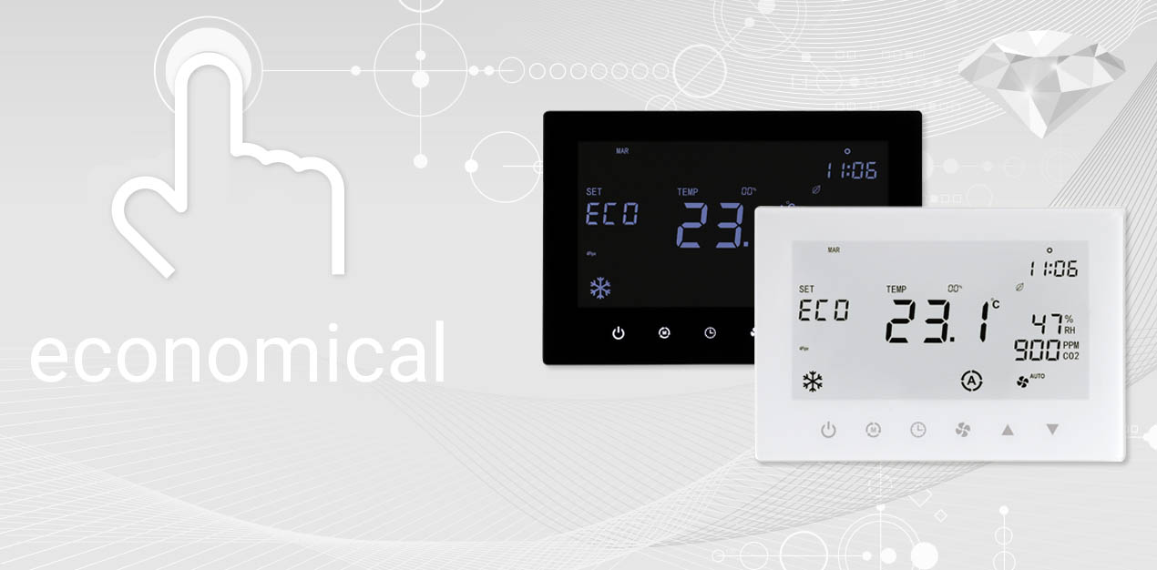 Nowoczesny, dotykowy termostat do klimakonwektorów, przeznaczony do regulacji temperatury w pomieszczeniu. Jest dostosowany do współpracy z klimakonwektorami 2- i 4-rurowymi oraz zaworami ze sterowaniem modulacyjnym (PWM i 0..10 V). Ponadto LCF02 Touch posiada dwa konfigurowalne wejścia cyfrowe, np. jako informacja o zajętym pomieszczeniu, kontaktron okienny, styk czujnika punktu rosy lub funkcji „change-over”. Dodatkowo wyposażony jest w wejście dla zewnętrznych (zdalnych) czujników temperatury oraz interfejs RS485 Modbus do nadpisywania parametrów sterowania. Dzięki konstrukcji podtynkowej LCF02 Touch łączy technologię cyfrową z dotykowym ekranem (LCD), co zapewnia intuicyjną obsługę termostatu i klimakonwektora. Ponadto zapewnia zintegrowany, 7-dniowy harmonogram z 4 przedziałami czasowymi.