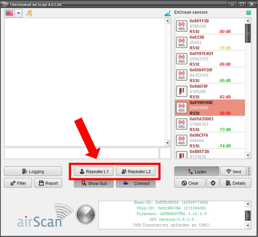La position correcte pour un répéteur peut être déterminée par l'outil logiciel airScan. Si la portée radio d'une application n'est pas suffisante, placez le Transceiver USB EnOcean presque au centre entre l'émetteur et le récepteur. Activez maintenant le niveau de répéteur nécessaire 1 ou 2.