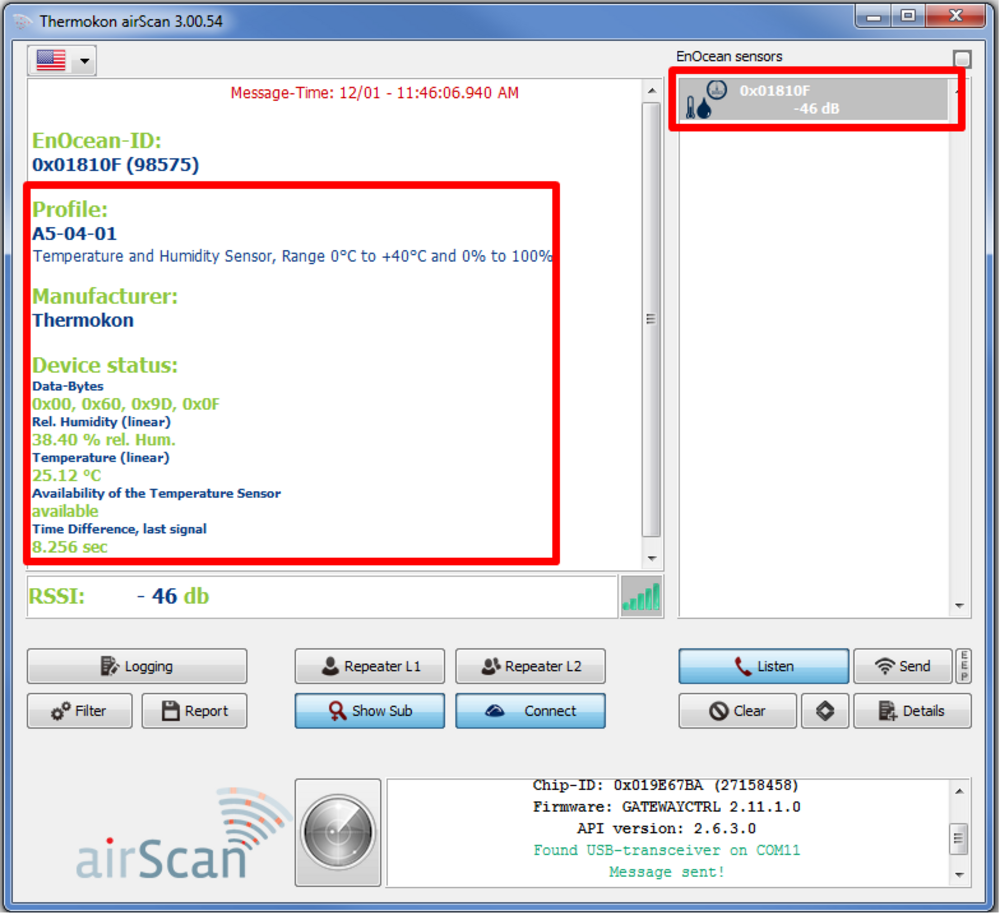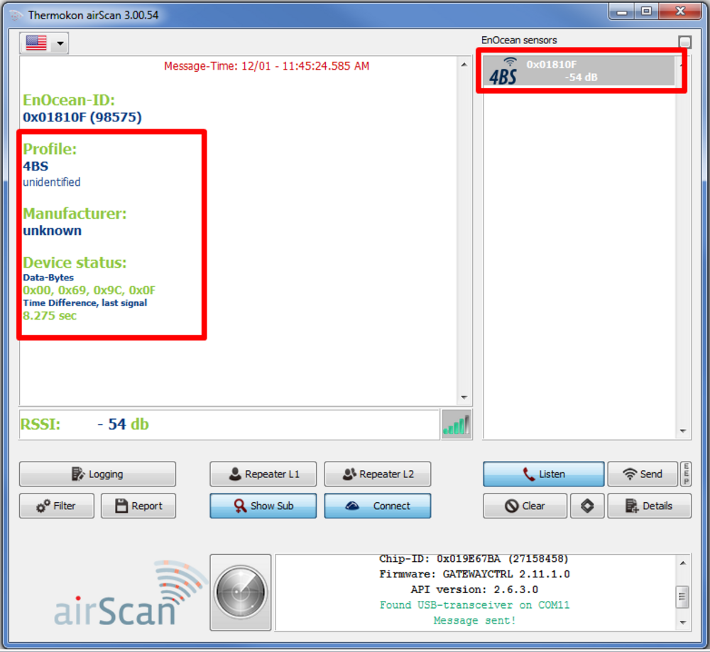 Ce télégramme d'apprentissage est envoyé en appuyant sur le bouton d'apprentissage de l'appareil. Si le télégramme d'apprentissage est envoyé, le type de capteur et le profil EEP sont affichés dans airScan. Les données transmises sont maintenant décodées et affichées.