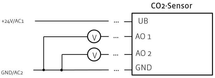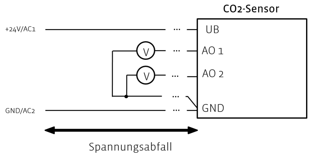 Werden die analogen Ausgänge des CO2 Sensors über die gleiche GND Leitung wie die Spannungsversorgung angeschlossen, kommt es zu Abweichungen. Dies ist dem unvermeidbaren Spannungsabfall entlang der GND-Leitung geschuldet. Die Höhe der Abweichung hängt auch hier von der Länge, dem Querschnitt und der Betriebstemperatur der Anschlussleitung ab.