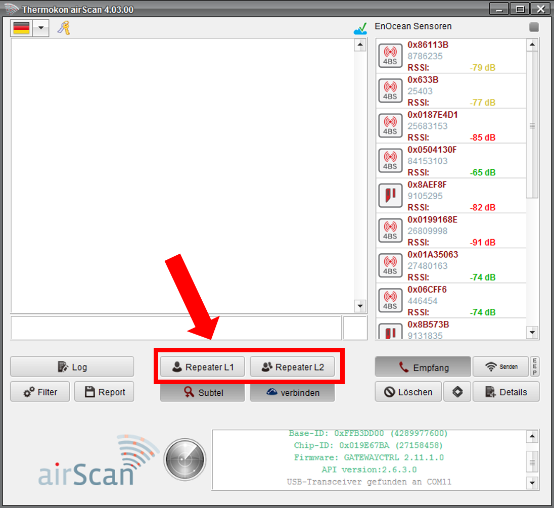 Mit Hilfe des Softwaretools airScan lässt sich die richtige Position für einen Repeater ermitteln. Sollte die Funkreichweite einer Anwendung nicht ausreichen, platzieren Sie den EnOcean USB Tansceiver in etwa mittig zwischen Sender und Empfänger. In airScan können Sie nun den gewünschten Repeater (Level 1 oder Level 2) aktivieren.