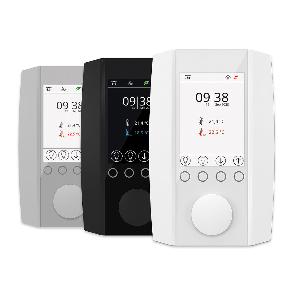 Le unità ambiente ambiente "NOVOS 5" e "NOVOS 3" completano la nuova famiglia di prodotti. "NOVOS 5" è disponibile con un pulsante RGB-LED integrato per la visualizzazione dello stato di funzionamento, la manopola di regolazione del set point di temperatura e un interruttore rotativo per la selezione dello stadio del ventilatore. Il modulo più piccolo "NOVOS 3" è dotato di una mnopola per regolare il set point e di un pulsante RGB-LED.