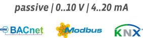 passive, 0..10 V, 4..20 mA, RS485 Modbus, BACnet, KNX
